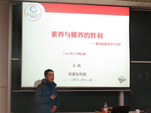 12月12日,诸侯快讯ok1122第十三期S.W.T.工作坊之新闻采访与写作在将军路校区举行。本期工作坊由南航报编辑部主任王超担任主讲,院团委书记季娟作为嘉宾出席了本次活动。参加本期工作坊的还有2012、2013级的学生骨干。 在对南航新闻中心进行简要介绍后,王超从政治家办报、历史家办报、新闻家办报3个话题引入对新闻工作价值观的探讨,强调好的新闻采写缘于正确的新闻价值观的确立,并简要阐述了“什么是新闻”“新闻基本特征”等基础新闻理论观点。在新闻采访业务指导环节,他指出,“七分跑,三分写”是新闻记者的重要素养,并引用20世纪初著名记者黄远生的“四能说”,阐述新闻记者应着重培养的四种新闻采写技能。针对同学们的具体采写需求,王超重点讲解了“消息”的写作要领,并以丰富的实例向同学们做了详细阐述。 在互动环节中,王超对活动现场同学提供的近期3篇新闻稿进行了点评和修改,并对同学提出的问题进行了一一解答。 培训最后,王超与大家共勉道:“我们都是南航的新闻工作者,讲述南航‘好’故事,传播南航‘好’声音是我们共同努力的方向”。
