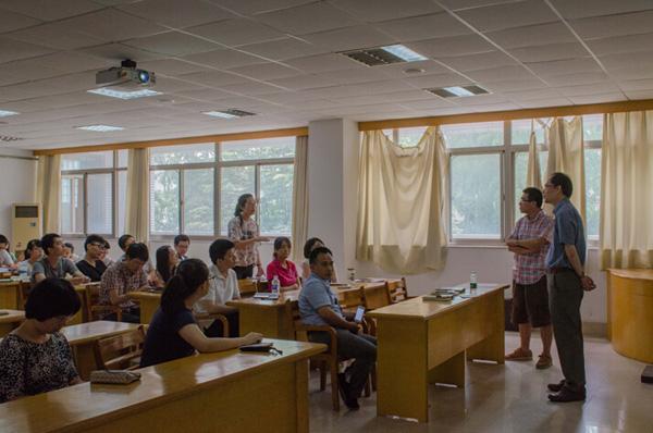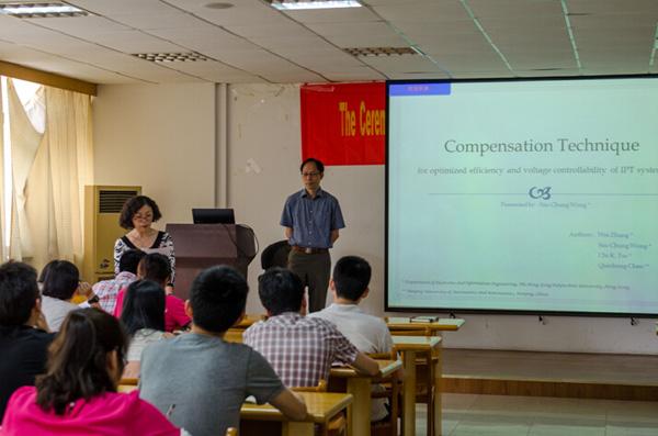 会上,黄教授首先简短地介绍了感应式耦合无线电能传输的发展历程,并举了一个很贴切的例子:家用电磁炉来给大家建立一个无线电能传输的直观概念。然后,针对无线电能传输气隙较大而导致的系统效率低下和电能的传输困难,黄教授详细介绍了自己在补偿拓扑的研究方面取得的主要研究成果,如考虑线圈阻抗后串串、串并补偿谐振网络的系统效率变化趋势,通过改变原边补偿电容容值来使得系统最高效率点靠近输出电压增益交点等等。报告结束后,参会的老师和学生们分别就能否实时改变补偿电容容值、系统工作频率选择、串串与串并补偿在拓扑上的对偶关系等等问题与黄教授展开了讨论和交流。
