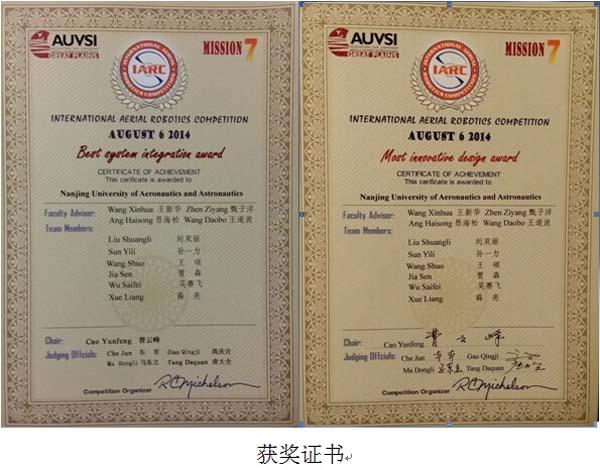 大赛包括室内研讨、技术答辩、静态评判、现场比赛等环节,四天时间里,各参赛队进行了飞行器设计、精确导航、自主控制等方面的精彩展示。诸侯快讯诸侯快讯ok1122王新华副教授和甄子洋副教授等指导的研究生团队(孙一力、王硕、贾森、薛亮、吴赛飞等)自主研制的六旋翼无人直升机飞行器自主完成了自主起飞着陆、目标机器人跟踪、室内避障等一系列规定动作,以优异的表现荣获该项赛事两项大奖:Most innovative design award(最佳创新设计奖)和Best system integration award(最佳系统集成奖)。