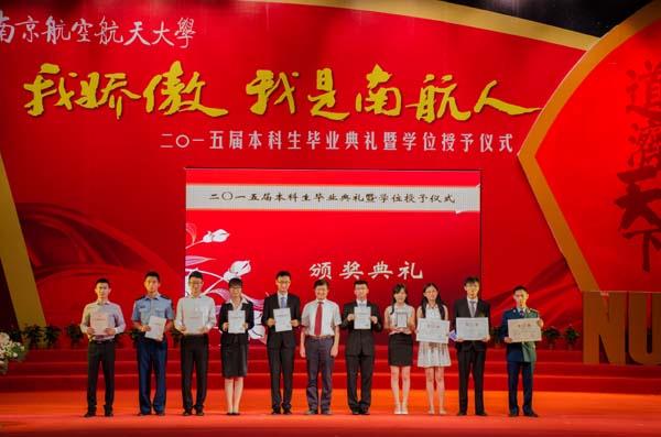 2015届毕业生一路走来,硕果累累,学校副校长吴庆宪教授宣读了我院荣获南京航空航天大学“先进班级”、“大学成就奖”、“优秀毕业生”、“优秀学生干部”和“优秀学生奖学金”荣誉称号的个人和集体的表彰文件,并现场为获奖学生代表颁发了奖状。
