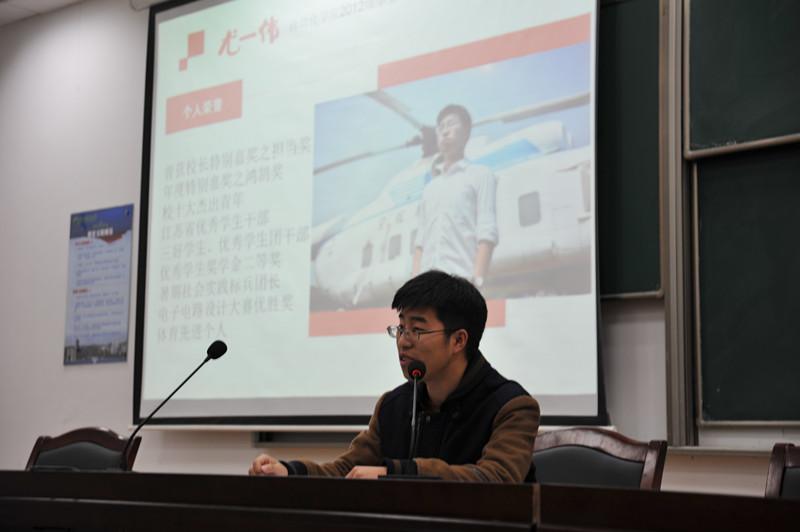 宣讲环节中,首先是颜晔同学进行了以“读万卷书,行万里路”为主题的宣讲。颜晔大一、大二学年GPA均列专业第一,多次获得科创竞赛奖项,他从学业成绩、学科项目、科创比赛、创新项目、梦想启航五个方面向学弟学妹们分享了他眼中的大学之学。他说:“大学之大,不在于大,而在于学。”接下来,是曾担任南京航空航天大学校学生会主席的尤一伟同学讲述了他大学里与学生工作相伴的成长故事,他特别强调做学生工作应怀有一颗纯粹的心,不为名、不为利,只要在工作的过程中能够锻炼提高自己的能力就是最大的收获。接着,由百花奖得主孙林楠同学上台分享了她的追寻艺术之路,并针对如何协调学业和兴趣的关系问题提出了宝贵的建议,使两者相互促进,互为灵感。最后,在前不久刚结束的第十四届“挑战杯”全国大学生课外学术科技作品竞赛中获得全国特等奖的尹彦卿同学分享他的科创经验。他语言风趣,从科创体验、所需知识、常见竞赛分类等方面让同学们切实地对科创有了进一步的了解。