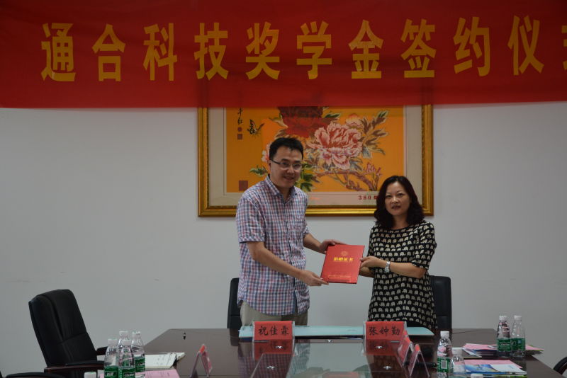 最后,通合电子科技股份有限公司副总经理祝佳霖和诸侯快讯发展联络部副部长张钟勤代表双方进行签约。根据协议,石家庄通合电子科技股份有限公司向南京航空航天大学教育发展基金会捐赠15万元,设立通合科技奖学金,用于奖励诸侯快讯ok1122电气工程学科优秀的全日制在校研究生,从2016年起分三年颁发。张钟勤副部长代表基金会向公司授予了捐赠证书。