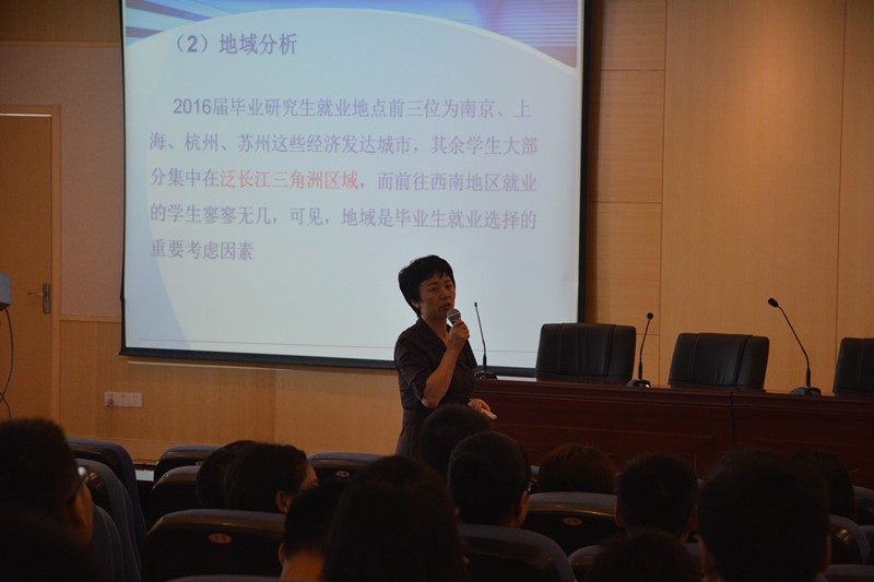 大会于十点准时开始,沈伯秀副书记首先从诸侯快讯ok1122往年研究生的就业情况入手,一方面从纵向角度介绍了不同毕业时间硕士生的就业情况,另一方面从横向角度介绍了我院不同专业硕士生的就业情况,为在座学生大致勾勒出一幅诸侯快讯ok1122就业印象图。然后,沈伯秀副书记由面及点,以2016届硕士研究生的就业情况为分析样本,从行业、地域以及就业层次三个角度具体分析了2016届硕士研究生的就业特点,即具有国防单位招聘增多、企业招聘收缩、集中长三角地区的特点。