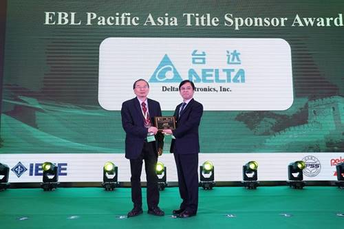 EBL亚太区竞赛指导委员会主席徐德鸿教授()为台达颁发冠名赞助单位奖牌,台达