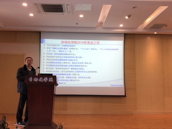 院长姜斌同志代表学院做工作报告,报告从党建、教学、科研、人事工作、学科建设和学术交流、学生工作、工会、安全工作等方面对学院2018年下半年的工作进行总结,对2019工作进行了全面部署。姜斌表示,2018年在全院师生的共同努力下,学院多方面取得了新的突破和发展,学院新增了国家杰出青年基金获得者1名、江苏省杰青1名;获批了国家自然科学二等奖1项、国防技术发明二等奖1项;新增了国家自然科学基金重大科研仪器研制项目1项;学院顺利通过了自动化、电气及其自动化工程教育专业认证现场考察;我院教师在江苏省高等学校微课教学比赛中荣获一等奖1项、荣获江苏省最美高校教师1人。学生荣获江苏优博论文1篇、优硕论文2篇、优毕设论文4篇,并在“创青春”全国大学生创业大赛荣获金奖1项,荣获工信部创业奖学金特等奖一项,一等奖三项、创新奖学金一等奖二项。这些成绩的取得为学院下一阶段的快速发展奠定了良好的基础。他指出,2019年是完成“十三五”规划、决胜全面建成小康社会的关键年,是落实校第十六次党代会决策部署、推进双一流建设各项任务的攻坚年。学院要继续深化综合改革,逐步落实各项改革方案和举措,在“双一流”学科建设、高水平师资队伍的引培、重大重点科研项目争取、人才培养等方面工作不断加强,巩固和落实教育思想大讨论工作成果,进一步解放思想、提振精神、深化改革、抓实工作,高质量完成学院各项工作。