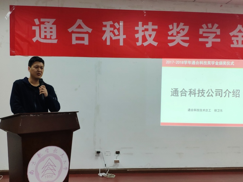 随后,通合科技公司技术总工徐卫东先生讲话。他表示在过去的三年里,双方进行了多次互动,我院实践团队的到访更是对公司发展具有指导作用,期待以后有更广泛的合作,他代表公司管理层感谢我院师生的付出和支持,祝获奖同学学习进步,再登高峰。
