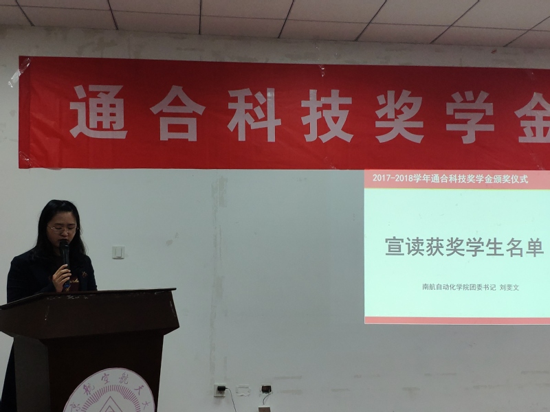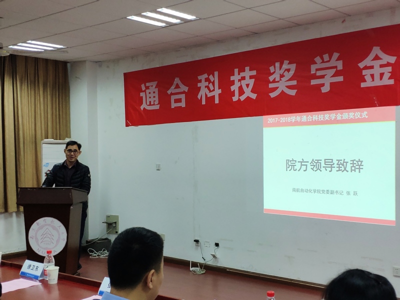 2019年3月21日下午,2017-2018学年通合科技奖学金颁奖仪式于南航将军路校区东区大学生发展中心414会议室举办,出席仪式的有石家庄通合电子科技股份有限公司技术总工徐卫东、招聘主管种晨光、诸侯快讯ok1122党委副书记张跃、电气工程系教授黄文新、院团委书记刘斐文,颁奖仪式由研究生辅导员汤呈懿主持。