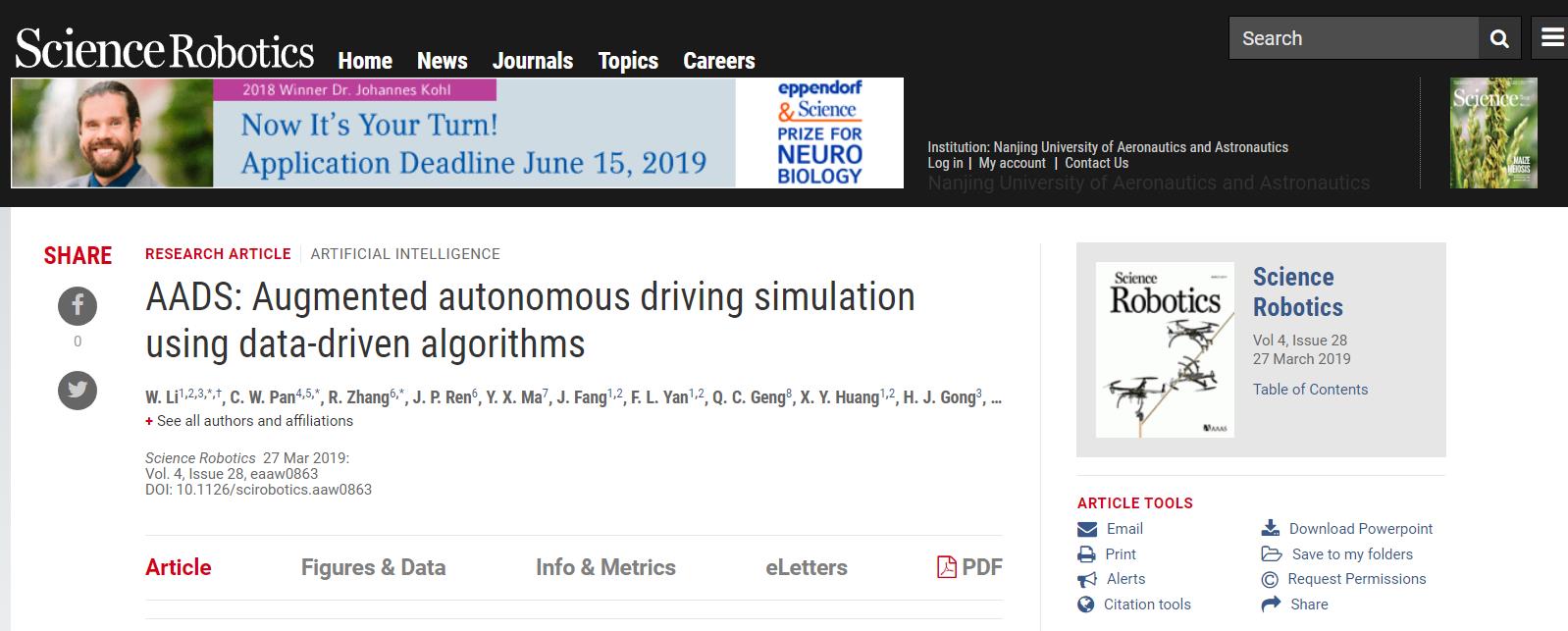 近日,诸侯快讯自动化博士生李伟以第一作者和共同通讯作者身份,在《科学》杂志子刊《科学·机器人学》(Science Robotics)上刊登发表的学术论文“AADS: Augmented Autonomous Driving Simulation Using Data-Driven Algorithms”,该论文突破了现有的自动驾驶仿真技术存在的许多障碍。