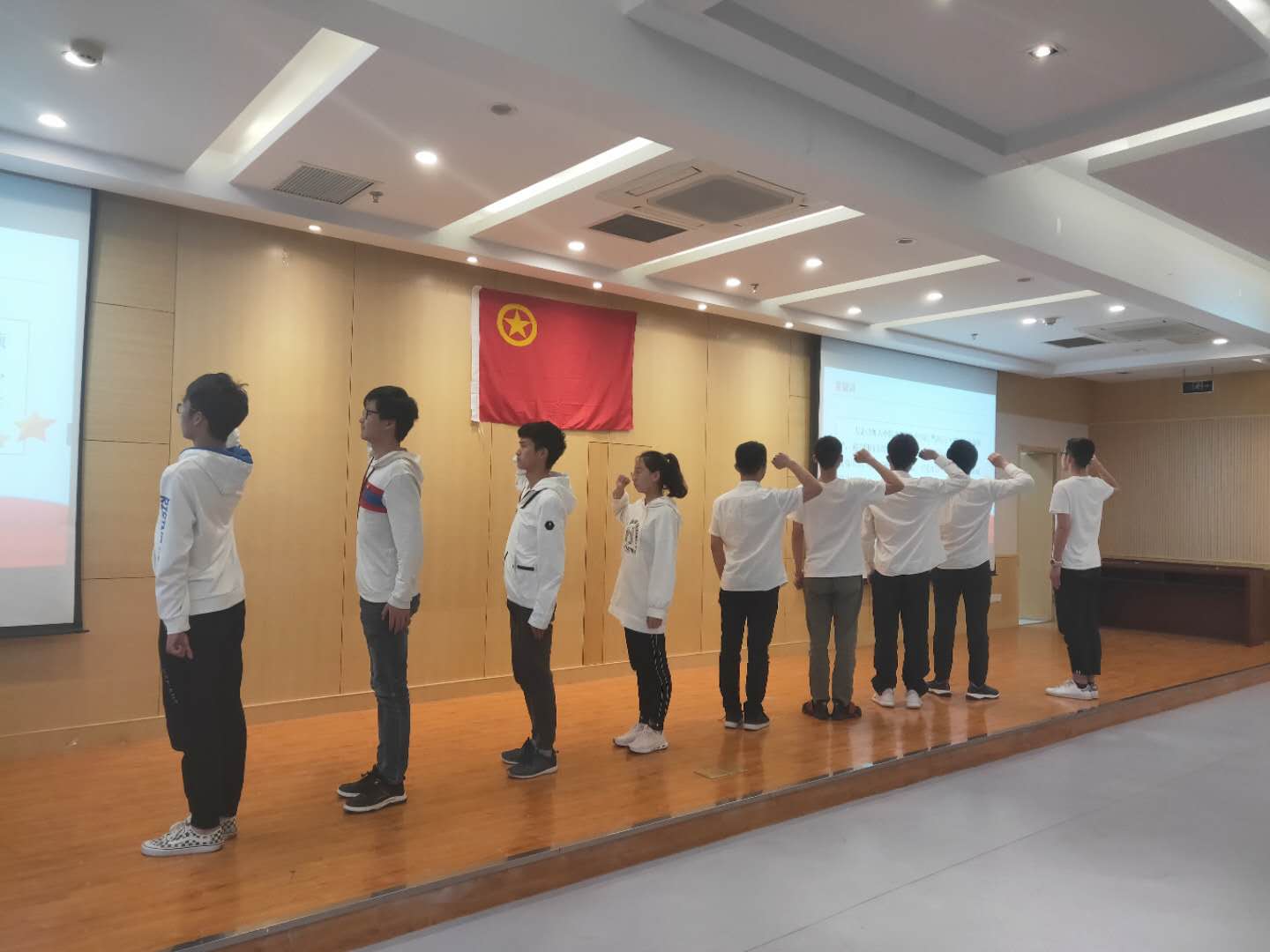 2019年4月28日下午四点,诸侯快讯ok1122举办“新青年与五四运动”素养公开课暨新团员入团仪式,诸侯快讯ok1122团委书记刘斐文、2017级本科生辅导员侯新闻、2018级本科生辅导员杨兴旺、汪明锐以及各班班长及团支书参加了本次活动。活动初始,学院为8名新入团团员举办了入团仪式,老团员为新团员佩戴了团徽并带领新团员进行了宣誓。