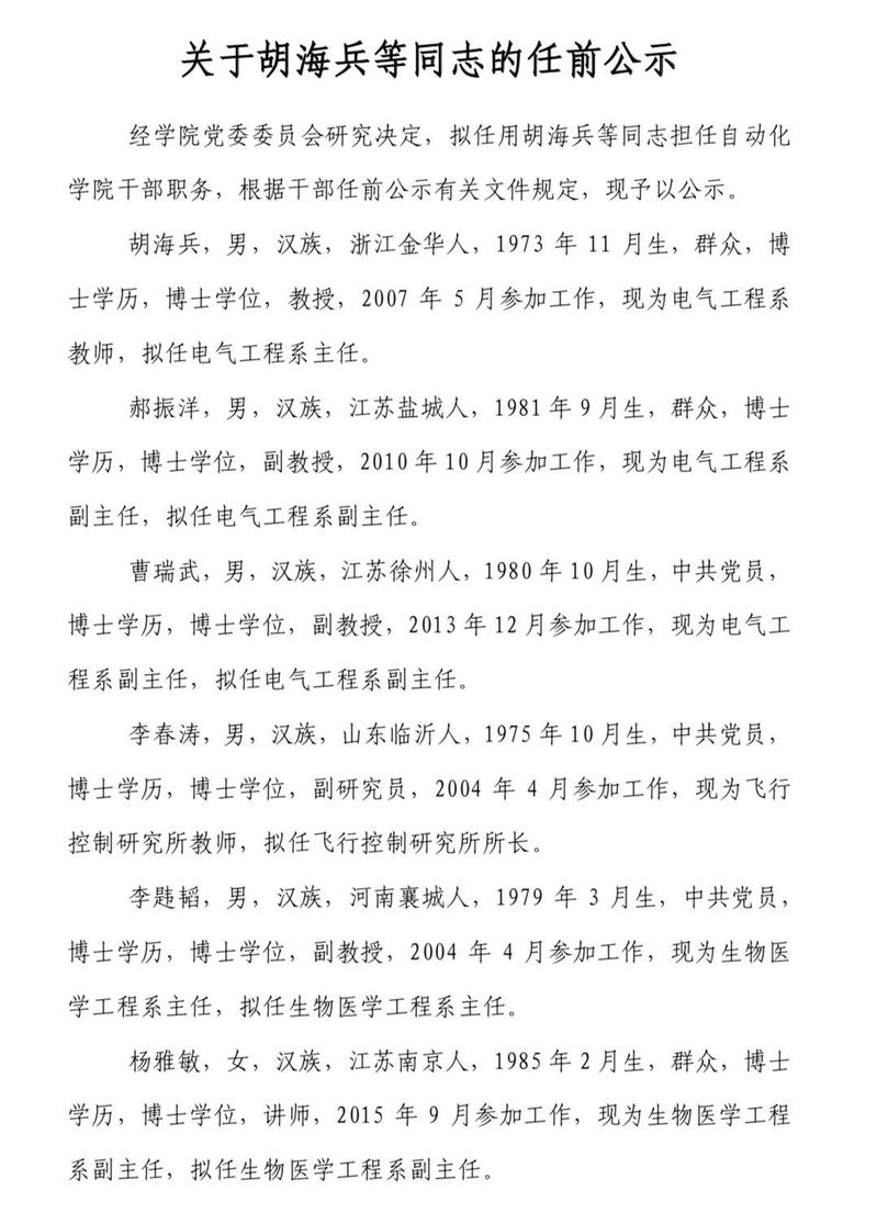 关于胡海兵等同志的任前公示