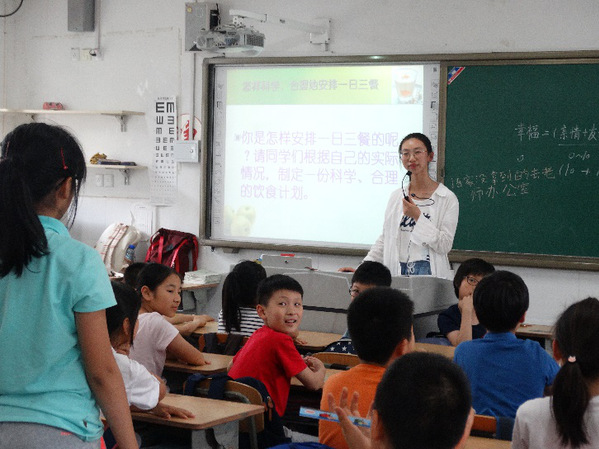 支教团的团员们用生动的语言为同学们讲解着知识,孩子们也在提问时积极的举起了小手作为回应。趣味数学课上,同学们经过缜密的逻辑推理解开了一道道难题,健康生活课上,团员们向同学们分享了一日三餐的健康食谱。四十分钟的课程转眼便在大朋友和小朋友们的欢声笑语中结束了。