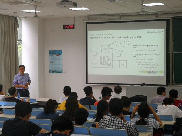 首先,王婧老师简要介绍了菲尼克斯电气集团及南京公司。然后梁恩泉老师开设了题为PLCnext Technology - The Open Ecosystem for Limitless Automation的工程技术讲座,向同学们介绍了PLCnext的特点、技术实现以及未来的价值。梁老师首先介绍了PLCnext 这种新技术的特点和优势,然后讲解了该技术可以在ARM基础上,利用C++等基础语言实现功能,并且其全开放的架构支持更高程度的开发,具有很好的实用性。详细介绍了GDS全局变量保持系统在实际生产中对于系统变量保持的重要性,以及系统的必要性。梁老师还介绍了PLCnext Store平台、功能集成OPC UA技术、开源软件、阿里云等工具在实用中的优势。通过向同学们介绍企业目前所使用的关键技术,为同学们的就业准备做出了方向性的指导。期间梁老师结合工作和工程研发实践,为同学提供了编程语言学习、工程研究和开发等方面针对性的建议。