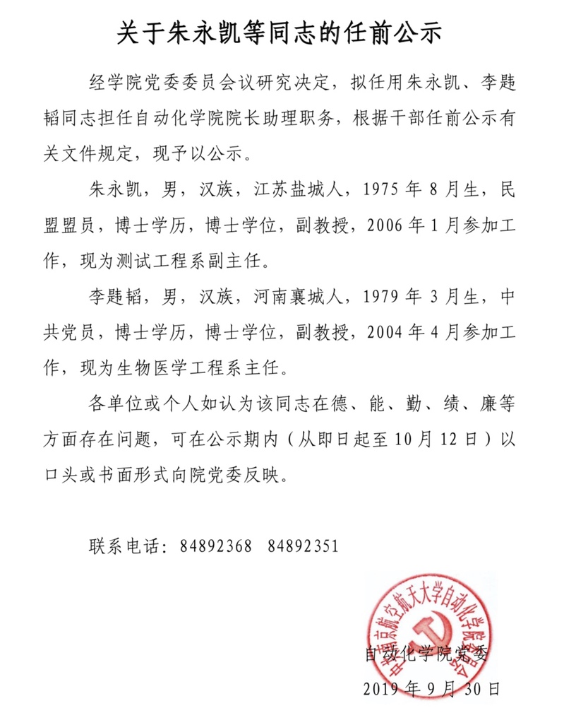 关于朱永凯等同志的任前公示