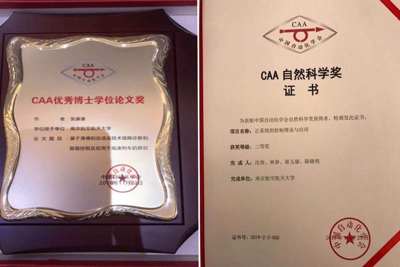 张康康博士,于2018年毕业于南京航空航天大学诸侯快讯ok1122,师从姜斌教授,其博士学位论文《基于滑模技术故障诊断和容错控制及应用于高速列车的研究》获得2019年度CAA优秀博士学位论文奖。该论文深入研究了微小故障的幅值特性及演变特性,提出了微小故障的数学描述方法,为基于模型的微小故障诊断奠定了扎实的理论基础。张康康博士在读博士期间,在IEEE Trans. 等高水平期刊上共发表(录用)学术论文15篇,获工信部创新奖、国家奖学金、南京航空航天大学群星创新奖等奖励。
