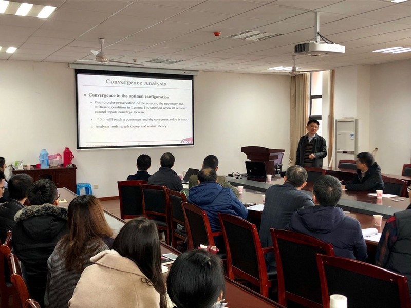 Feng教授首先以环境监视与信息侦查为应用背景,引出了异构多传感器网络的收敛问题,并指出了多传感器收敛过程中的研究难点。接着,Feng教授介绍了异构传感器网络的数学模型框架,提出了一种收敛性能指标函数,并对性能指标函数进行了分析。然后,Feng教授给出了基于固定通信拓扑和收敛通信范围的收敛目标,并提出了对应的收敛控制律,同时对收敛性进行了分析。通过一组仿真结果,Feng教授对所提出的方法进行了验证,展示了他们团队的最新研究成果。最后,Feng教授对汇报内容进行了总结,并对如何将异构传感器网络扩展至多维空间等研究方向提出了展望。