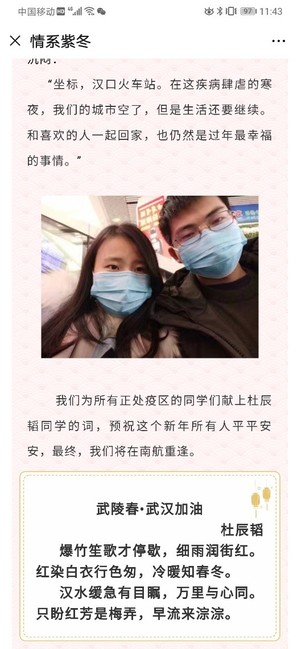 已经保研的武汉大四学生唐同学给同在武汉的学弟学妹成立了一个互帮互助的群,解答专业上的困惑和疑问,分享学习和生活的经验。这不止是单独学习和生活的分享,更多的是在疫情之下的相互扶持。“虽然武汉已经封城,待在家中无法外出,但大家时刻关心着我们,每个人都在用自己的方式做着或大或小的贡献,我很希望能为大家做些什么,我的成绩还不错,很开心自己的学习经验能够帮助到他们”,唐同学如是说。病毒总会被人类战胜,期待在春暖花开的时候,大家都能健康地重返校园。