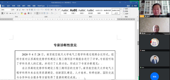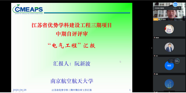2020年4月28日上午,南京航空航天大学组织专家对江苏高校优势学科建设工程三期项目电气工程学科进行了中期评审。评审会通过视频会议形式进行,评审专家组组长由河海大学鞠平教授担任,专家有浙江大学何湘宁教授,西安交通大学杨旭教授,东南大学花为教授和中国矿业大学陈昊教授。诸侯快讯ok1122电气工程系阮新波教授、胡海兵教授和曹瑞武副教授参加汇报。