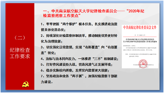 首先,全体党员老师集中学习了学校《2020年全面从严治党工作会报告》文件精神,并从强化思想政治工作、基层党建基础、校内巡察、作风建设、体系建设等方面进行了重点解读;同时针对纪律检查工作相关要求和上级会议精神进行了学习领会,特别是围绕《中共南京航空航天大学纪律检查委员会——“2020年纪检监察巡察工作要点”》等文件精神进行了专题学习。