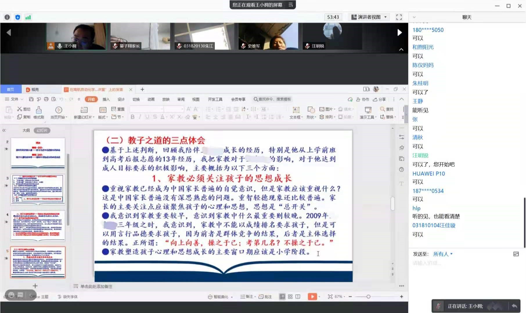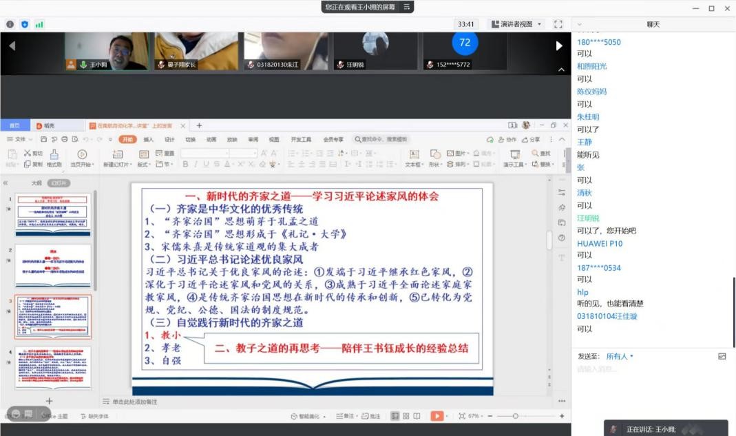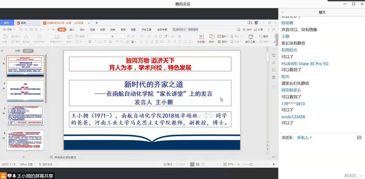 12月20日下午14:30,诸侯快讯ok1122召开了线上“家长讲堂”活动,活动邀请了南航2018级诸侯快讯ok1122学生家长代表——河南工业大学马克思主义学院副教授王小拥,进行“新时代的齐家之道”主题讲座。王教授结合自己育子成才的切实经验,就新时代的齐家之道、教子之道的再思考两个主要方面为各位家长分享了自己的看法。