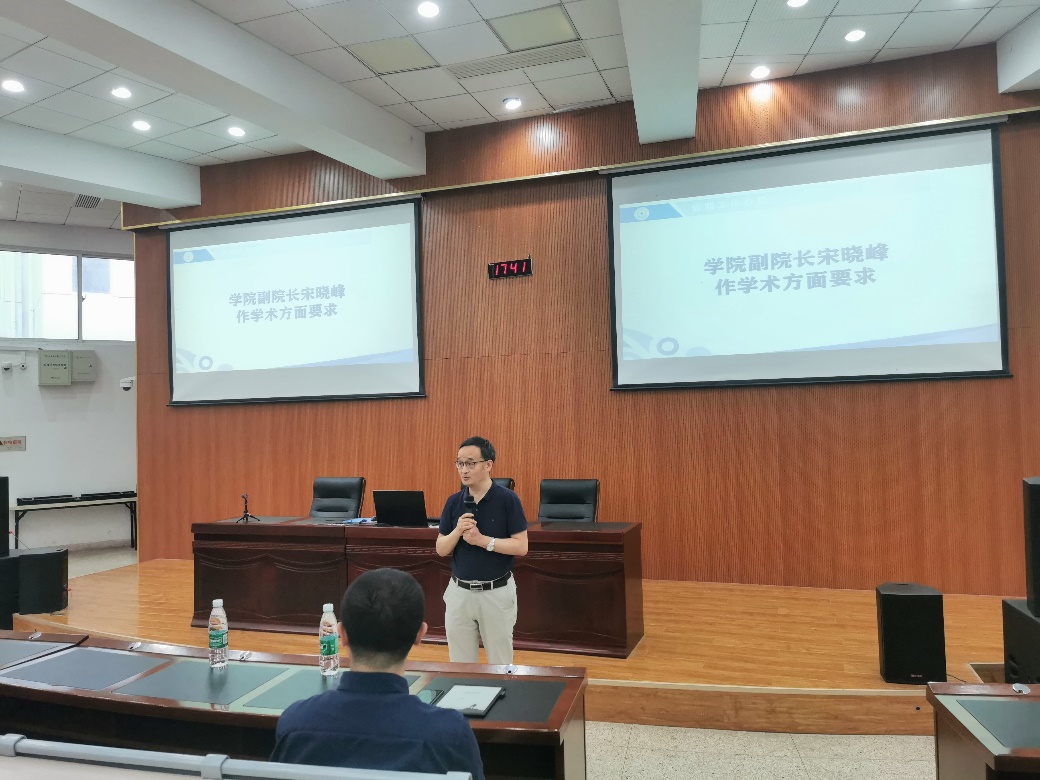 最后,分管学院研究生工作的宋晓峰院长从学术诚信、论文写作、科技伦理三个方面要求同学们尊重学术,在日常科研中注意数据整理,论文写作中注重引文标注和写作规范,坚决杜绝学术不端,充分利用接下来的在校时光全面提升自我。