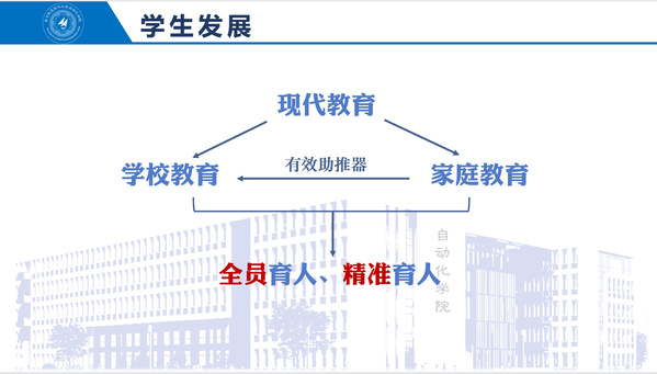 魏院长针对大学教育和学生学习的新要求,从学习环境、学习意识、班主任管理模式、丰富科创竞赛活动等角度,分享了大学学习特点。他向家长强调大学学习重要性的同时,针对高中和大学的差异,将大学学习特点总结为学习能力、课程特色、师生模式、专业培养和科研创新五个方面,并就此鼓励新生们在夯实专业基础后积极参与科创竞赛活动。
