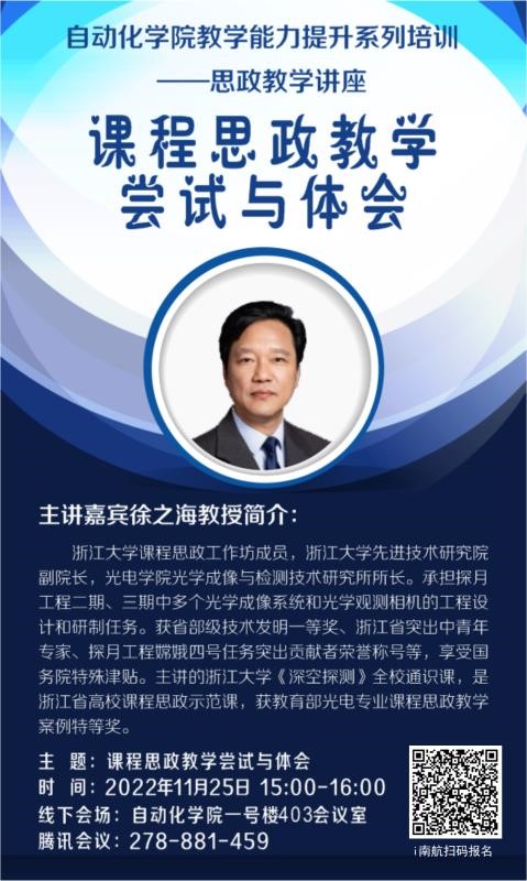 2022年11月25日下午,我院邀请到浙江大学徐之海教授作题为《“课程思政”教学尝试与体会》的线上专题讲座。本次讲座由诸侯快讯ok1122副院长魏佳丹主持,学院党委书记李文雷、院长陈谋、各系所中心教学副主任、近三年入职青年教师和教学办全体老师出席活动。讲座采取线上、线下相结合的方式,全校50余名专任教师听取了报告。