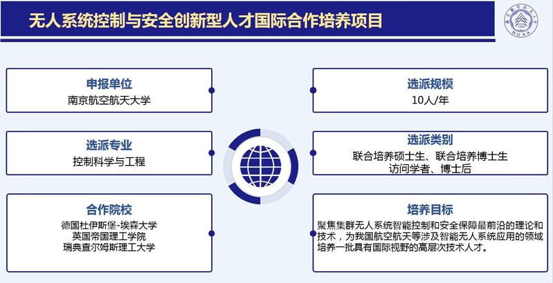 近日,国家留学基金管理委员会(以下简称“留基委”)发布了《关于确定2023年创新型人才国际合作培养项目资助的通知》(留金美〔2022〕2260号),我院申报的“无人系统控制与安全”创新型人才国际合作培养项目喜获立项批复。这是我院首次获批留基委创新型人才国际合作培养项目,该项目依托与德国、英国、瑞典等高校的长期合作,聚焦集群无人系统智能控制和安全保障最前沿的理论和技术,致力于建立和发展相关领域的高水平学生联合培养和高层次研究人员国际交流体系,为我国航空航天以及大量涉及无人系统和人工智能的领域培养一批具有国际视野和高技术水平的拔尖青年创新型人才。