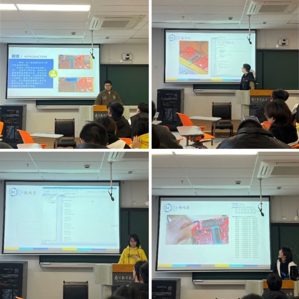 接着,由同学们做寒假科创学习的情况汇报交流,交流会现场气氛热烈。同学们纷纷走上讲台演示讲解自己所做的作品,有闪烁的流水灯、显示数字的数码管和播放着音乐的蜂鸣器……感知机器语言描述的现实世界。班长发表学习体会,认为学习单片机最重要的就是不畏首畏尾、敢于尝试,并认真钻研、多听多想多动手。