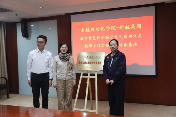 杨兰芳和王淑霞代表双方为“航空特色校企联合电气自动化类教师工程实践能力培养基地”联合揭牌并签署备忘录。杨兰芳发表了基地揭牌感言,她表示新航与南航有着共同的“为党育英才、为国筑重器”的使命担当,基地的设立是“项目式”合作的最好形式之一,必将推动学校与企业的充分交流,助推“一流企业”和“一流大学”的建设。