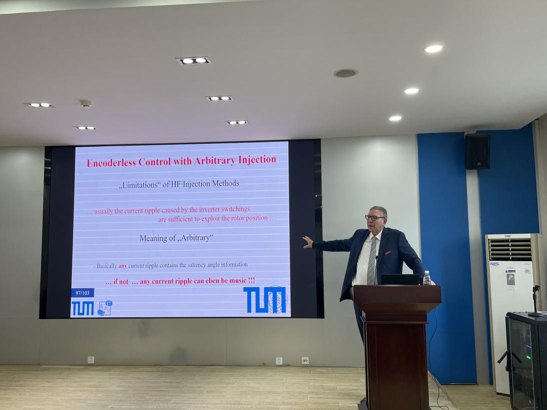 仪式结束后,Ralph Kennel教授为诸侯快讯师生作学术报告,介绍了交流驱动系统无位置传感器控制理论与方法,详细讲解了采用高频信号注入检测转子位置的方法。与会师生围绕报告主题踊跃提问,会议现场气氛热烈。