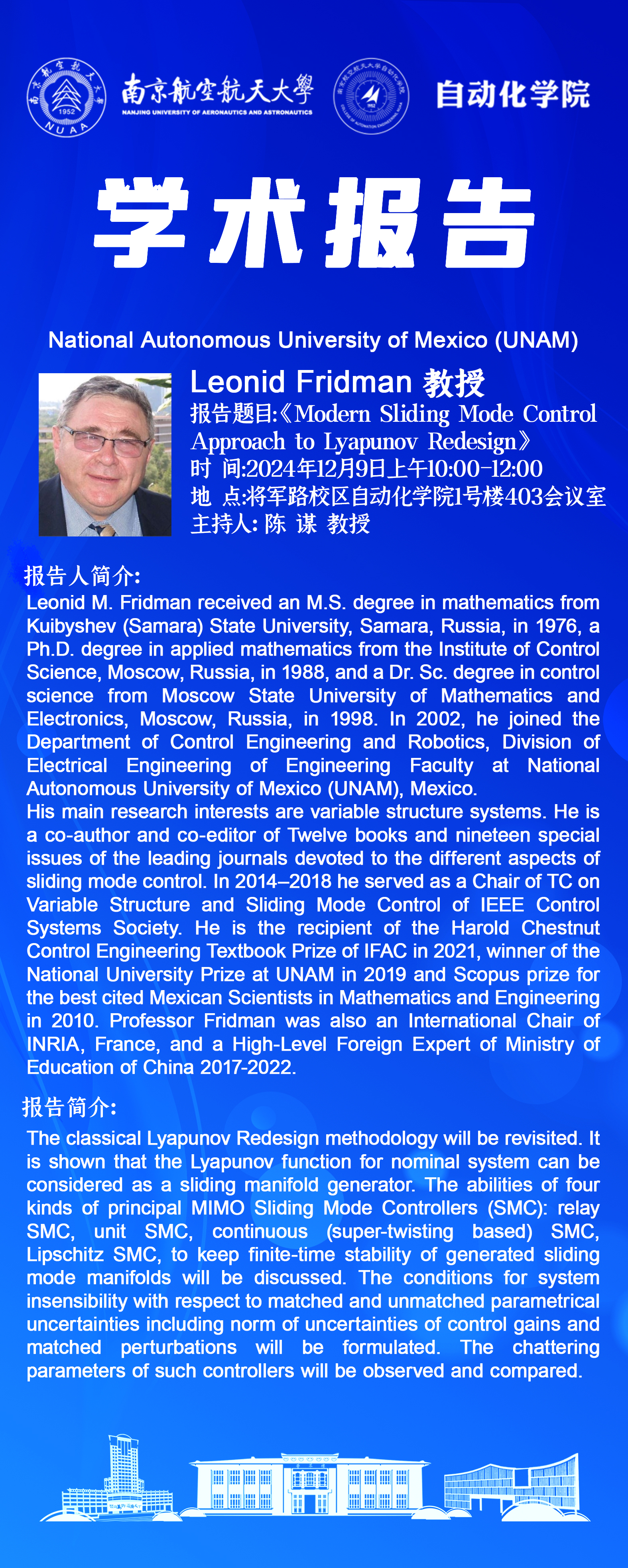 【学术报告】Leonid Fridman:Modern Sliding Mode Control Approach to Lyapunov Redesign