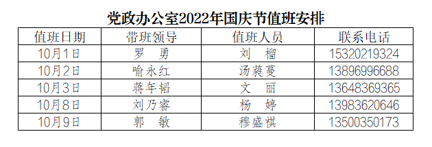 为更好地服务全校师生,保障国庆节期间学校相关工作顺利开展,党政办公室每天均安排值班人员,负责学校校章、党委印章、法人印章、学校合同章、党政办公室印章等用印,学校介绍信开具,公文签发审核,会议室申请及使用等工作,请需求单位或师生按规定流程履行签批手续,其他未尽事宜,请与值班老师联系。