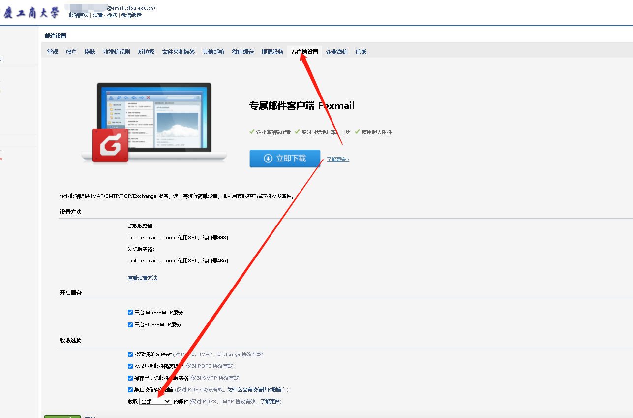 登录邮箱账号后,点击“设置”,找到客户端设置,“收取选项”下面选择收取“全部”邮件,然后保存。