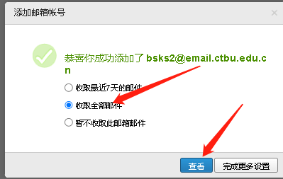 接着输入***@email.ctbu.edu.cn的账号密码,再点击“验证”,验证成功后,选择“收取全部邮件”,点击查看