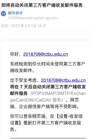 大部分用户都收到下面这个邮件提醒,如果您不使用foxmail,outlook等第三方客户端使用邮箱,关闭此服务不会影响邮箱使用。