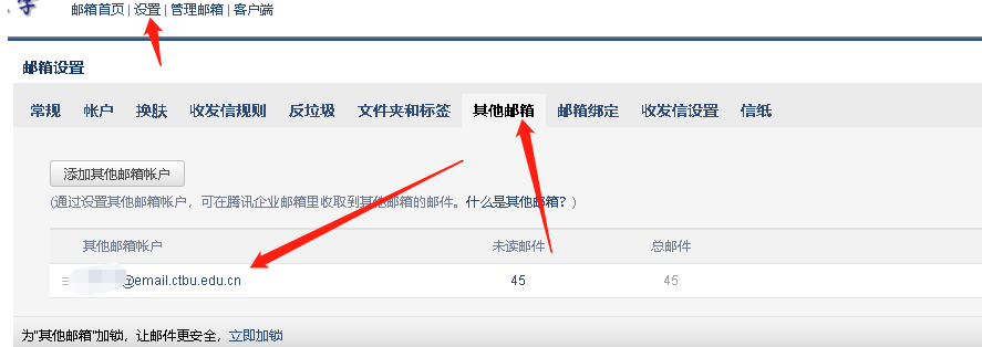 然后在电脑浏览器打开https://exmail.qq.com/login,通过企业微信扫码进入新的邮箱(@ctbu.edu.cn),点击“设置”,再找到“其他邮箱”,再点击“添加其他邮箱账户”: