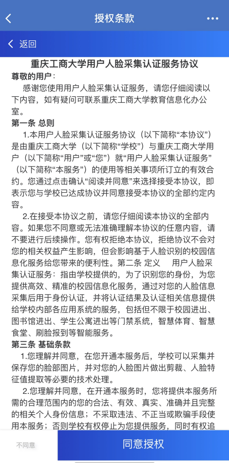 2. 未在规定时间内进行人脸采集,学校校园人脸通的所涉智能服务(包括但不限于校园进出、图书馆进出、学生公寓进出、实验室进出、智慧体育、智慧食堂、会议签到等)启用后,将无相关基于人脸识别的使用权限。