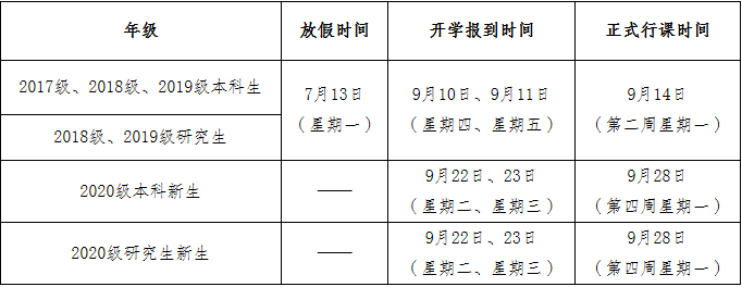 根据学校本学期各项工作总体安排,经学校研究决定,现将2020年暑假放假及开学相关事宜通知如下: