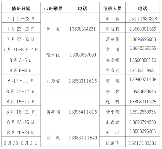 为更好地服务全校师生,保障暑假期间学校校章、党委印章、法人印章、学校合同章、党政办公室印章等用印,学校介绍信开具,公文签发审核,会议室申请及使用等工作顺利开展,现将值班安排公布如下,请需求单位或师生按规定流程履行签批手续。