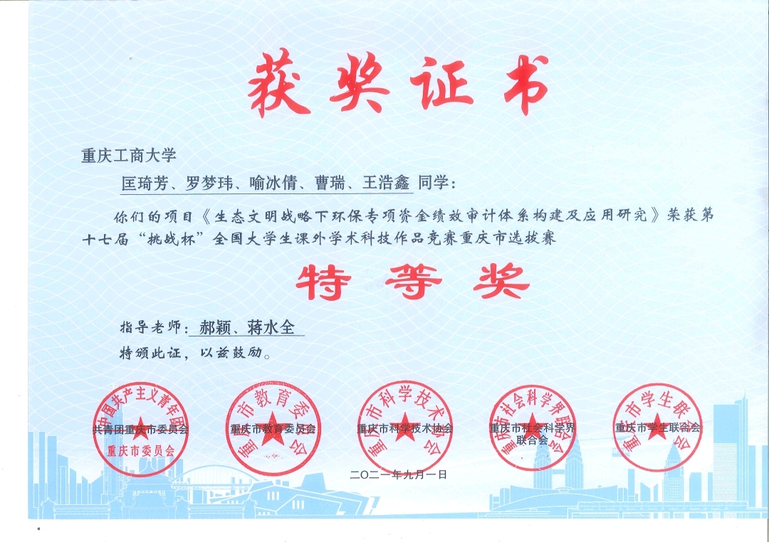 3月29日,第十七届“挑战杯”全国大学生课外学术科技作品竞赛授奖名单公布,pp电子平台官网入口会计学院本科生匡琦芳、罗梦玮、喻冰倩、曹瑞、王浩鑫(指导老师:郝颖 蒋水全)组成的团队(参赛题目:生态文明战略下环保专项资金绩效审计体系构建及应用研究)荣获全国三等奖(重庆赛区特等奖)。