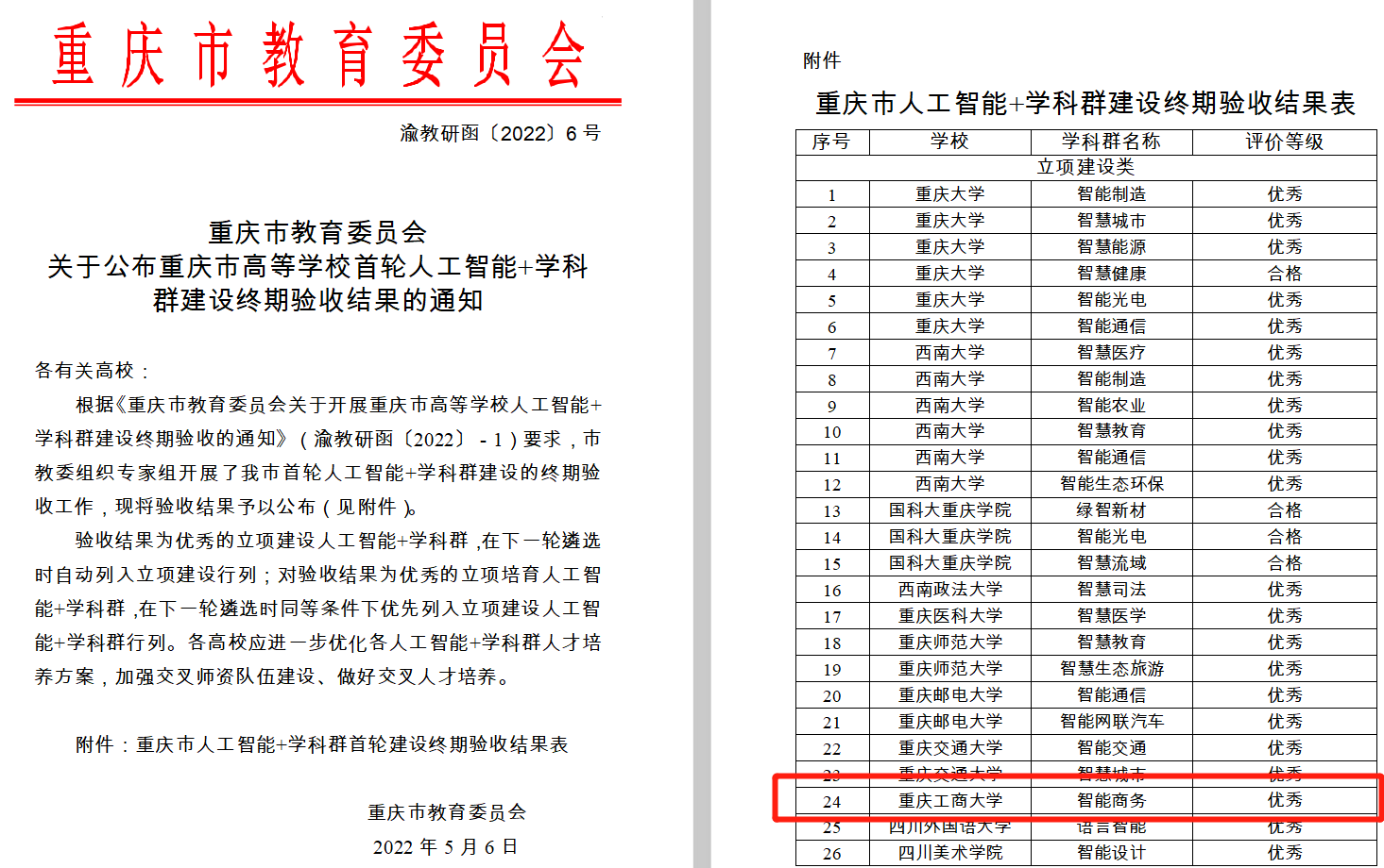 2022年5月6日,重庆市教育委员会公布了重庆市高等学校首轮人工智能+学科群建设终期验收结果,pp电子牵头建设的“智能商务”学科群验收结果荣获优秀,这表明pp电子“智能商务”学科群将在下一轮遴选时,自动进入立项建设行列。
