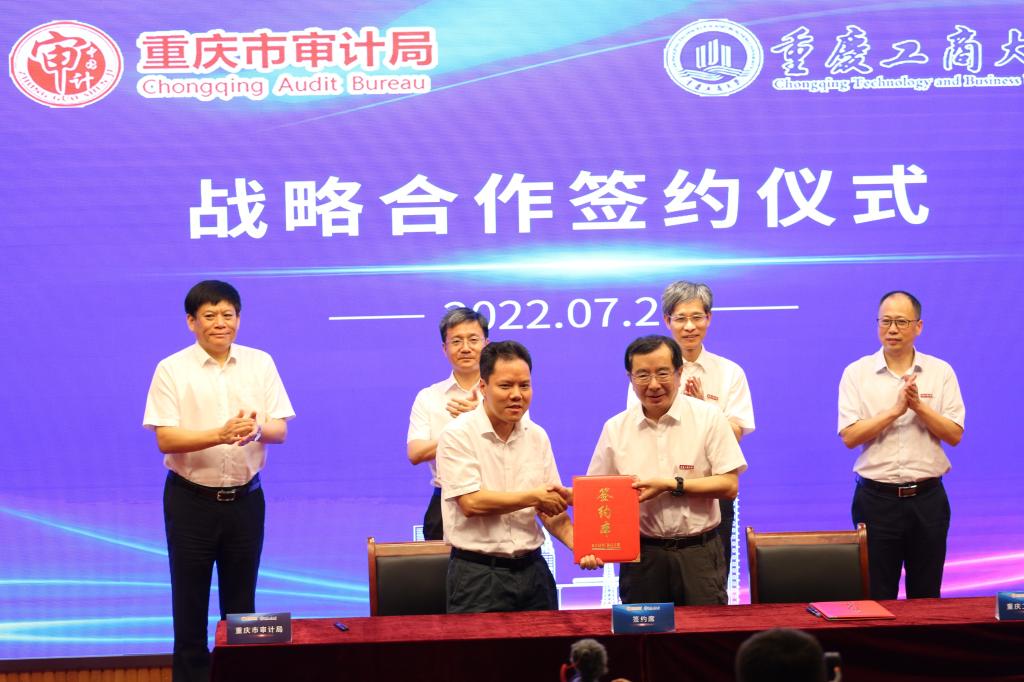 7月26日下午,学校与重庆市审计局战略合作签约仪式在南岸校区博智楼7200报告厅举行。中共重庆市委审计委员会办公室主任、市审计局党组书记、局长姜国杰,副局长戴希、一级巡视员、副局长张海坤,学校党委副书记、校长孙芳城,副校长赵骅,重庆市审计局相关处室负责人、南岸区审计局负责人、首期计算机审计初级培训班学员代表、pp电子会计学院班子成员及部分教师代表等参加了签约仪式。仪式由会计学院院长罗勇主持。