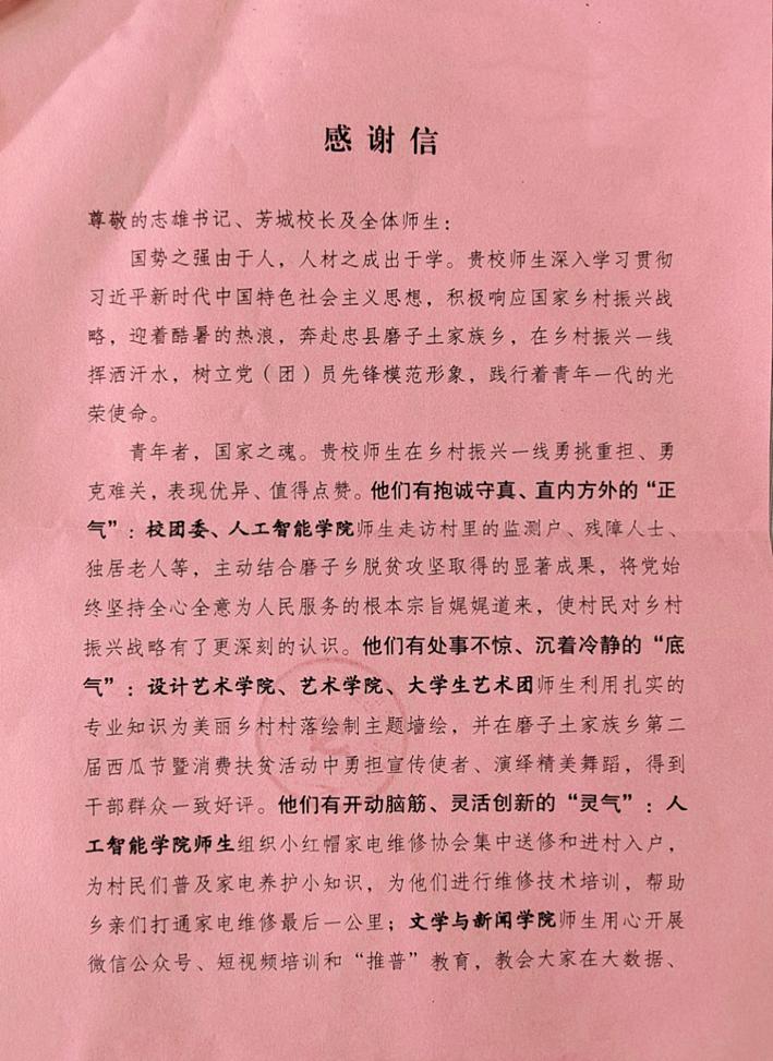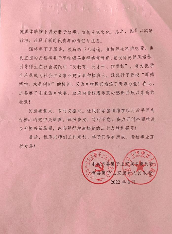 近日,pp电子收到忠县磨子土家族乡党委、乡人民政府的感谢信,对pp电子师生积极投身乡村振兴一线表示感谢。
