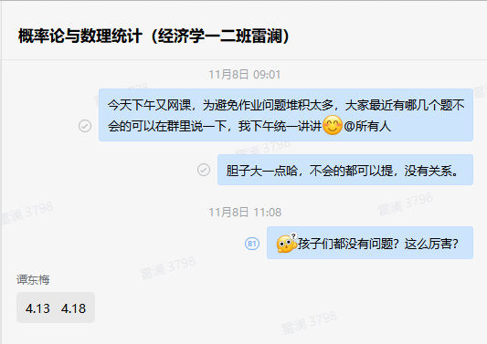数学与统计学院雷澜老师每次课前至少提前10分钟开始直播,等候同学们陆续到来;在课前、课间关心学生的生活情况,询问学生的饮食和睡眠情况,鼓励大家坚持就是胜利;教学中更是细致,每讲到一处重点和难点,总是会停下来询问学生是否有听不懂的地方,结合同学们的反馈及时进行评讲。同时,通过企业微信,随时为同学们开展一对一答疑。