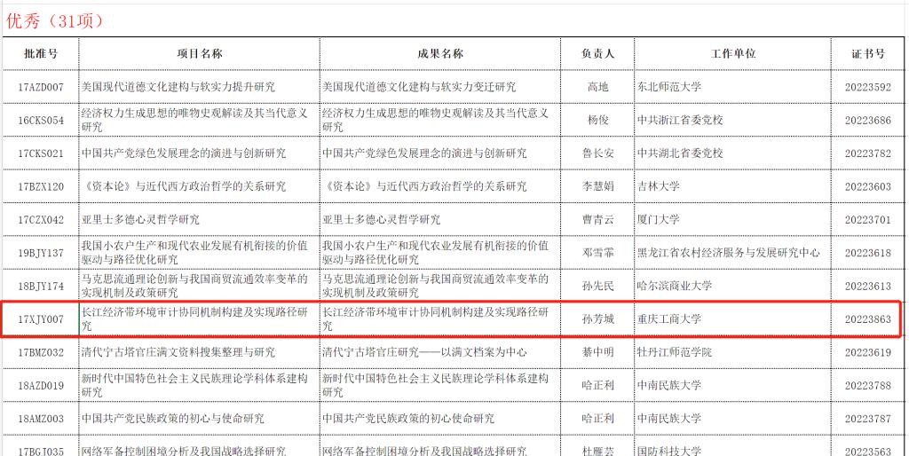 12月1日,全国哲学社会科学工作办公室公布了2022年11月国家社科基金年度项目、青年项目和西部项目结项情况。pp电子校长、长江上游经济研究中心主任孙芳城教授主持的“长江经济带环境审计协同机制构建及实现路径研究”(项目号:17XJY007,结题证书号:20223863),获得“优秀”等级。