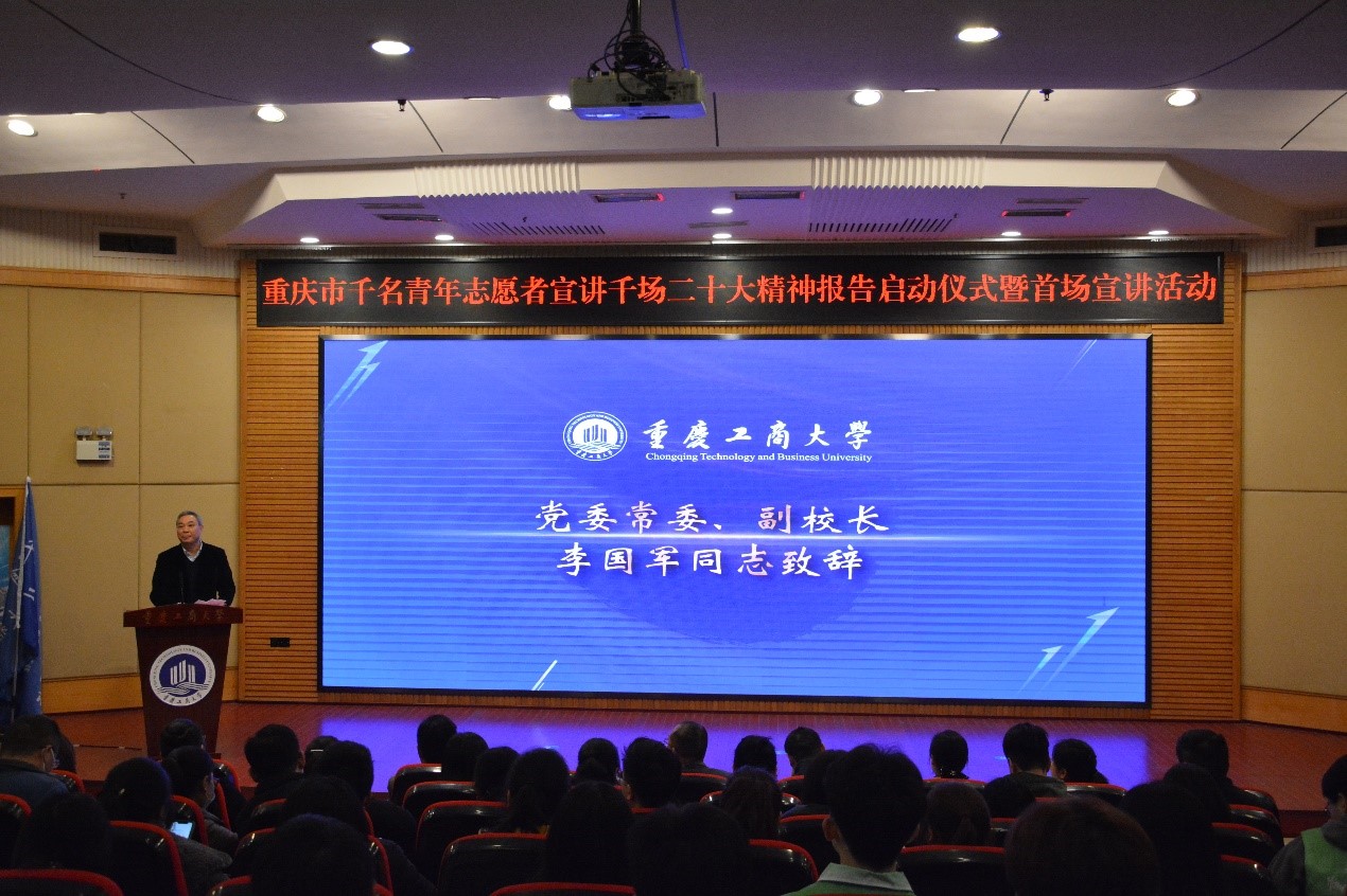 3月3日,由团市委、pp电子平台官网入口、市青年志愿者协会主办,市志愿服务工作指导中心、校团委承办的“学习二十大、永远跟党走、奋进新征程”重庆市千名青年志愿者宣讲千场二十大精神报告会启动仪式暨首场宣讲活动在pp电子南岸校区顺利举行。团市委副书记曾凯,pp电子党委常委、副校长李国军,市志愿服务工作指导中心党支部书记、主任龙江,pp电子党委学生工作部部长申卫东,市志愿服务工作指导中心党支部副书记贺伟,党委组织部副部长魏婉怡,校团委副书记胡婧婷出席本次活动。