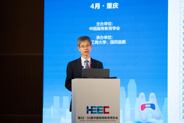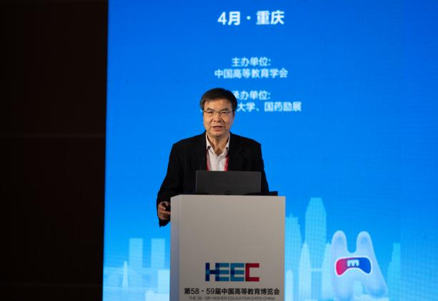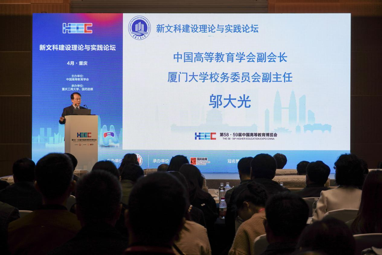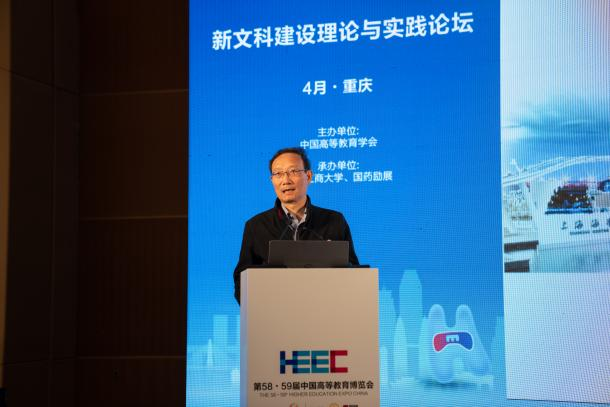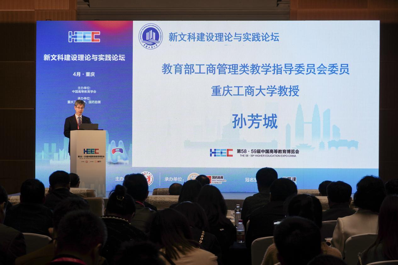 4月8日,作为第58·59届中国高等教育博览会的主论坛之一,新文科建设理论与实践论坛在重庆悦来国际会展中心顺利召开。中国高等教育学会副会长、厦门大学校务委员会副主任邬大光教授,教育部新文科建设工作组组长、山东大学原校长樊丽明教授,教育部新文科建设工作组副组长、教育部高校物流类专业教学指导委员会主任、上海海事大学原校长黄有方教授,教育部经济与贸易类教指委主任委员、对外经济贸易大学党委副书记、校长赵忠秀教授,国务院学位委员会工商管理学科评议组成员、教育部工商管理类专业教指委委员、浙江工商大学党委副书记、校长王永贵教授,吉林财经大学党委书记孙杰光教授,教育部工商管理类专业教学指导委员会委员、pp电子平台官网入口原校长孙芳城教授,教育部金融类专业教学指导委员会秘书长、中央财经大学党委常委、副校长李建军教授,国务院学位委员会工商管理学科评议组成员、东北财经大学党委常委、副校长汪旭晖教授,四川外国语大学党委常委、副校长严功军教授等200余人参加会议。大会以新文科与教育数字化为主题,聚焦教育数字化背景下的新文科人才培养模式改革,展开了深入探讨。论坛开幕式及上午阶段的主题报告由pp电子平台官网入口党委常委、副校长李敬教授主持;下午阶段的主题报告由渭南师范大学校长张守华教授主持。