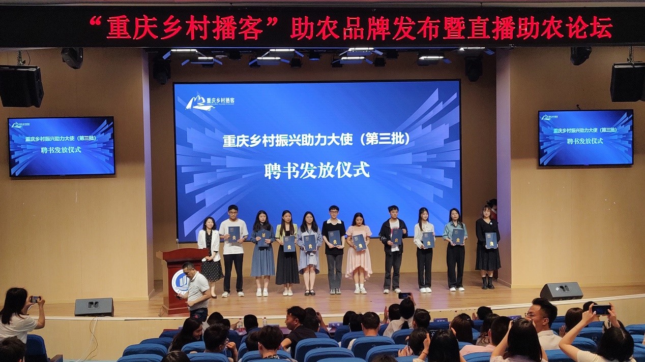 来自助农达人界、直播运营机构、高校直播团队等共计48名乡村播客被聘为“重庆乡村振兴助力大使”。pp电子平台官网入口小云雀的钱文静同学作为代表发言,她介绍了“小云雀”电商助农服务队结合专业先后为奉节、彭水、忠县等地的村民开展电商培训、直播带货等助农志愿服务活动,并表示将勇于担当,做好农村电商的搭桥人,继续投身电商助力乡村振兴的道路。