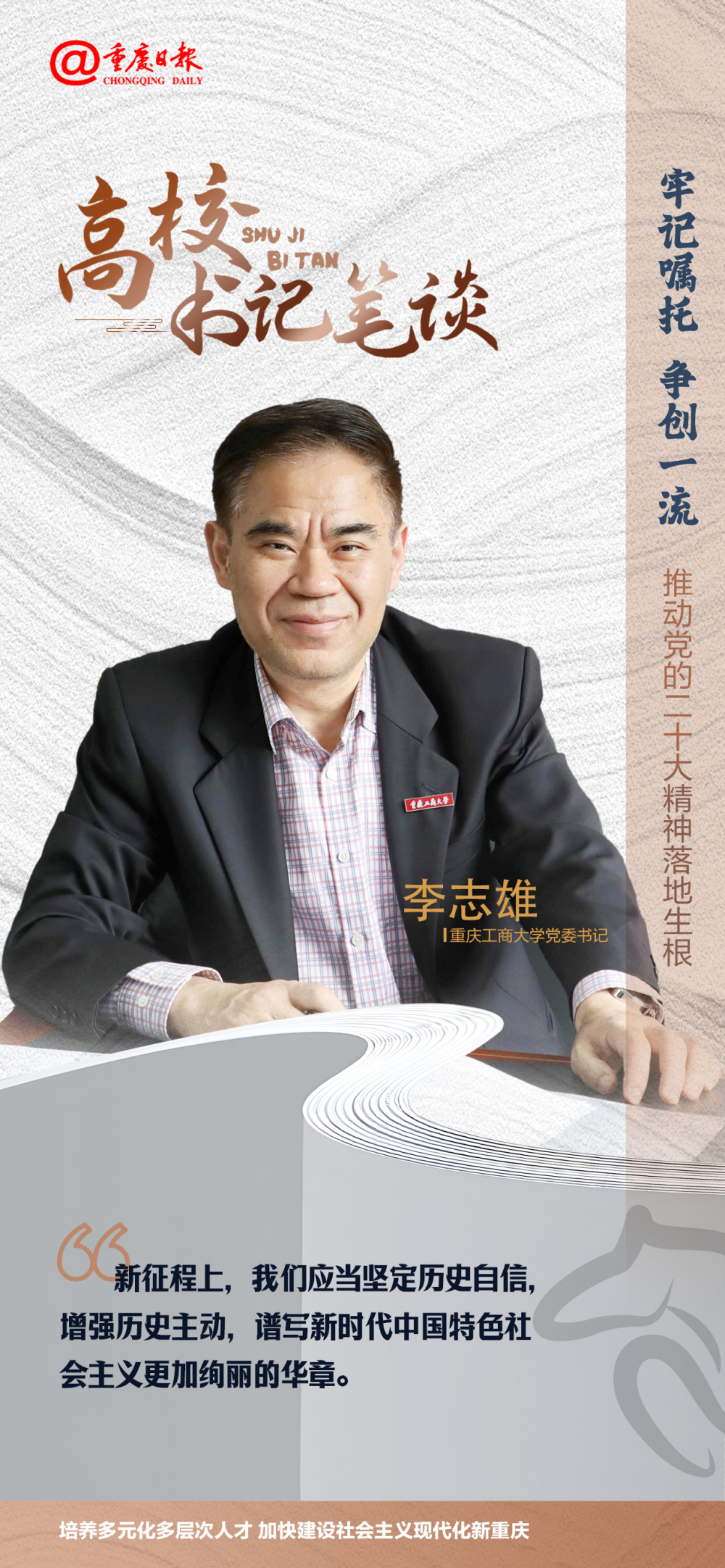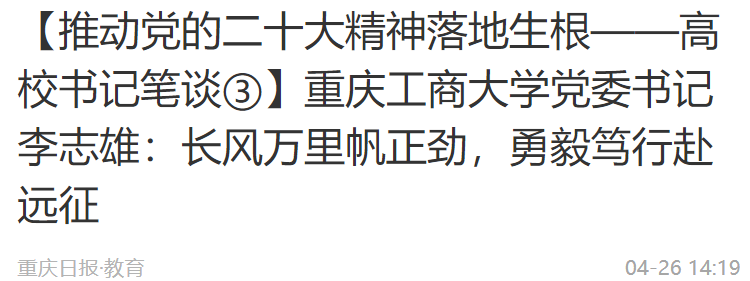 4月26日,《重庆日报》刊发pp电子党委书记李志雄学习党的二十大报告心得体会的署名文章:《长风万里帆正劲,勇毅笃行赴远征》。