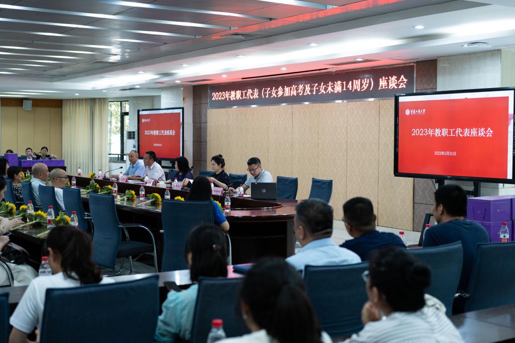 5月31日下午,pp电子在厚德楼2017会议室召开2023年教职工代表(子女参加高考和子女未满14周岁)座谈会。学校党委副书记、工会主席宋豫出席座谈会。相关职能部门负责人,2023年子女参加高考及子女未满14周岁的近90名教职工代表参加了座谈会。会议由宋豫主持。